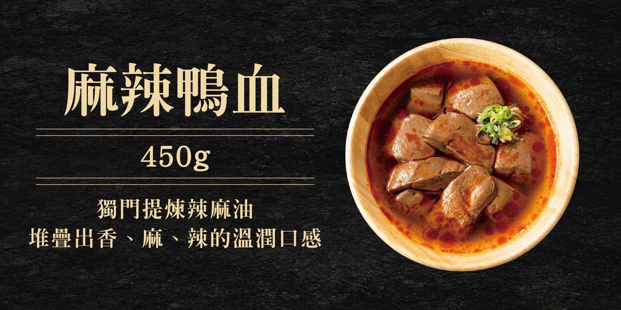內容物/成分:純鴨血(水、鴨血、鹽、多磷酸鈉、酸性焦磷酸鈉、消泡劑)、大豆沙拉油、辣椒粉、豆瓣醬(非基因改造黃豆、米、鹽、小麥、焦糖色素)、辣椒醬(新鮮辣椒、水、鹽)、紅蔥頭、大蒜、白芝麻油、黑豆鼓、白胡椒粉、老薑、郫縣豆瓣醬(鮮紅辣椒、蠶豆、鹽、小麥粉)、草果、甘草粉、肉桂粉、八角、丁香粉、子彈椒、朝天椒乾、燈籠椒、小茴香粉、鹽、L-麩酸鈉、麥芽糊精、糖、水解植物蛋白、調味劑(胺基乙酸、DL-胺基丙酸、琥珀酸二鈉、5'-次黃嘌呤核苷磷酸二鈉、5'-次鳥嘌呤核苷磷酸二鈉、二氧化矽、醬油、乳糖、玉米澱粉、乙基麥芽醇)