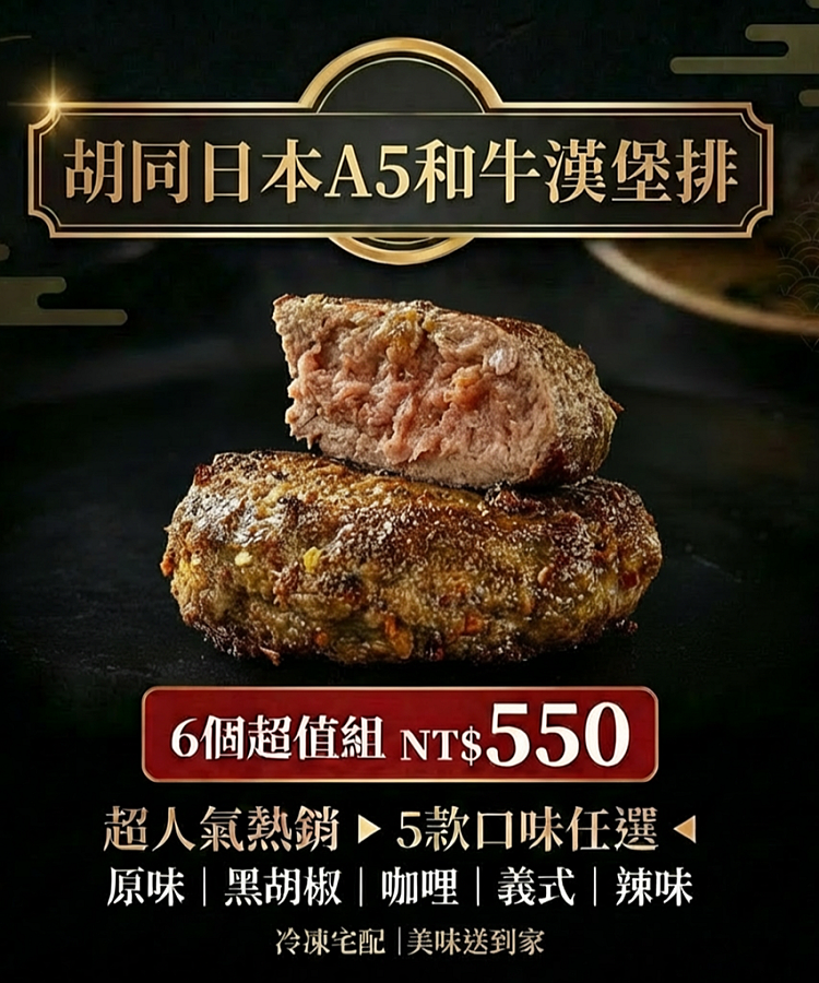 來自胡同超人氣熱銷系列日本A5和牛漢堡排・6 個超值組,五款口味任選 滿足所有和牛控的味蕾想像!