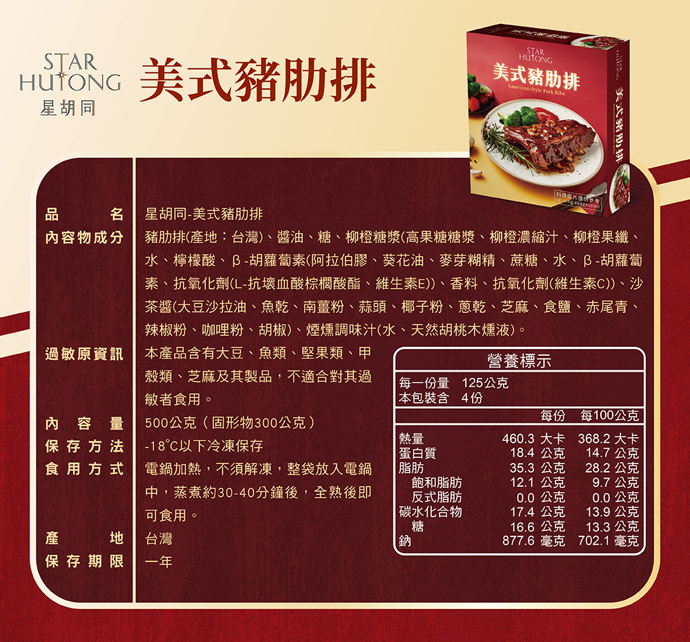 成分:豬肋排(產地:台灣)、醬油、糖、柳橙糖漿(高果糖糖漿、柳橙濃縮汁、柳橙果纖、水、檸檬酸、β-胡蘿蔔素(阿拉伯膠、葵花油、麥芽糊精、蔗糖、水、β-胡蘿蔔素、抗氧化劑(L-抗壞血酸棕櫚酸酯、維生素E))、香料、抗氧化劑(維生素C))、沙茶醬(大豆沙拉油、魚乾、南薑粉、蒜頭、椰子粉、蔥乾、芝麻、食鹽、赤尾青、辣椒粉、咖哩粉、胡椒)、煙燻調味汁(水、天然胡桃木燻液)